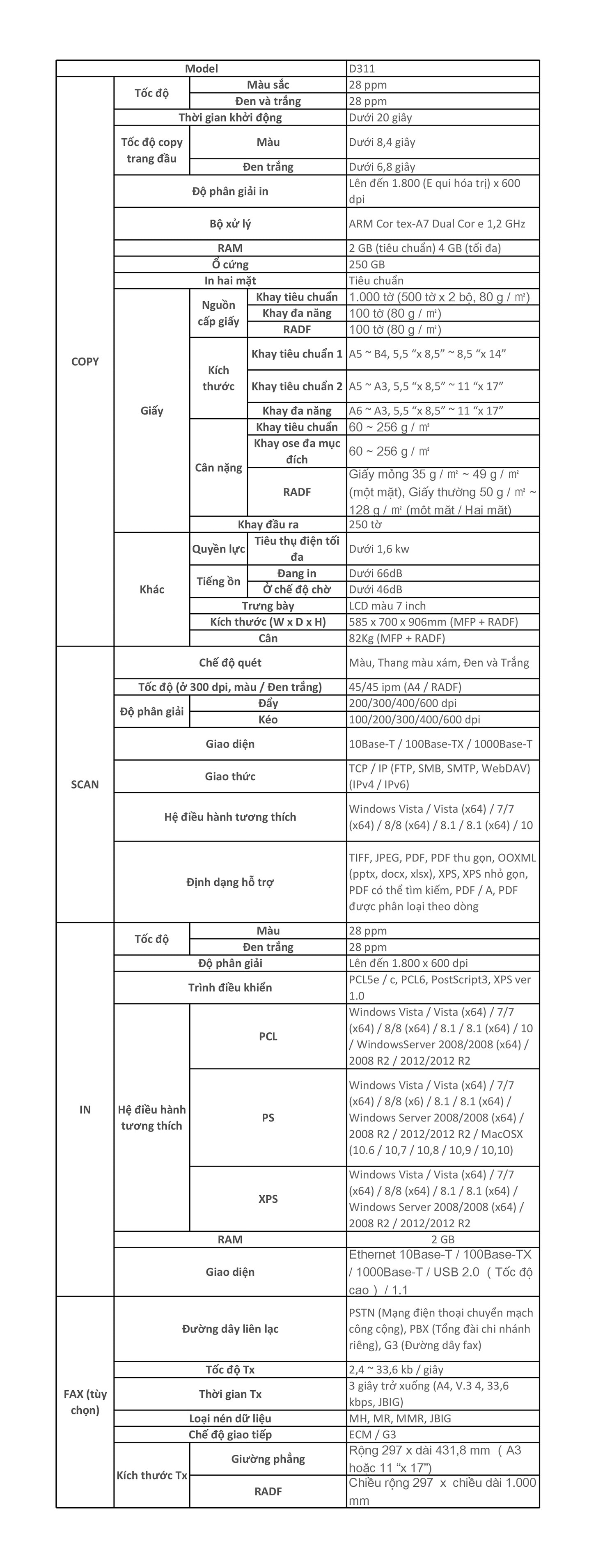 Thông số kỹ thuật máy photocopy Model N612 / N613 COPY Tốc độ 40 ppm / 45ppm Thời gian làm nóng trước Dưới 56 giây Đến trang đầu tiên Dưới 6,5 giây Độ phân giải 600 dpi Bộ xử lý Lõi tứ (Lõi kép 800 MHz + Lõi kép 533 MHz) RAM 2 GB In hai mặt Tiêu chuẩn Giấy Nguồn cấp giấy Khay giấy tiêu chuẩn 1.000 tờ (500 tờ x 2 bộ) Khay giấy đa năng 100 tờ Khay giấy RADF 90 tờ (75 g / ㎡) Tối đa 2.100 tờ (500 tờ × 4 bộ + khay giấy thủ công 100 tờ) Kích thước Khay giấy tiêu chuẩn 1 A5 ~ B4, 5,5 “x 8,5” ~ 8,5 “x 14” Khay giấy tiêu chuẩn 2 A5 ~ A3, 5,5 “x 8,5” ~ 11 “x 17” Khay giấy đa năng A6 ~ A3, 5,5 “x 8,5” ~ 11 “x 17” Khay giấy RADF Chiều rộng 139,7 ~ 297 x chiều dài 139,7 ~ 432 mm Khay giấy tùy chọn A5 ~ A3, 5,5 “x 8,5” ~ 11 “x 17” In hai mặt chiều dài 148 ~ 431,8 mm Cân nặng Khay giấy tiêu chuẩn 60㎡ ~ 220 g / ㎡ Khay giấy đa năng 60 ~ 220 g / ㎡, OHP, Phong bì Khay giấy RADF 50 ~ 128 g / ㎡ Khay giấy tùy chọn 60 ~ 220 g / ㎡ In hai mặt 60 ~ 209 g / ㎡ Khay đầu ra 250 tờ Khác Điện năng Tiêu thụ điện tối đa 1,1 kW trở xuống Chế độ ngủ 4,2 W trở xuống Tiếng ồn Đang in 73 db Ở chế độ chờ 48 dB trở xuống Hiển thị 9˝Color LCD Kích thước (W x D x H) 559 x 599 x 802,9 mm Cân nặng 55 Kg Không bắt buộc Bộ fax, khay giấy đôi, In di động, Wi-Fi QUÉT Chế độ quét Màu, Thang màu xám, B & W Tốc độ (Quét ở 300 dpi, Màu / B & W) 45 ipm / 55 ipm Độ phân giải 150/200/300/600 dpi Kích thước quét Giường phẳng Chiều rộng 297 x chiều dài 431,8 mm (A3 hoặc 11 “x 17”) RADF Chiều rộng tối đa 297 x chiều dài 1.000 mm (300 dpi trở xuống) Chiều rộng tối đa 297 x chiều dài 432 mm (600 dpi) Giao diện Ethernet 10Base-T / 100Base-TX / 1000Base-T, Thiết bị USB 1.1 / 2.0, Máy chủ USB 1.1 / 2.0 Giao thức TCP / IP (FTP, SMB, SMTP, WebDAV) (IPv4 / IPv6) Hệ điều hành tương thích Windows 7/8 / 8.1 / 10 (32bit / 64bit), XP (SP3) / Vista (SP2), Windows Server 2003/2008 R2 SP1, 2012, Macintosh OSX 10.5, 10.6, 10.7, 10.8, 10.9, 10.10, 10.11 Driver Trình điều khiển TWAIN / WIA Định dạng hỗ trợ TIFF, PDF, JPEG IN Tốc độ in 40 ppm Tốc độ in trang đầu tiên 6 giây trở xuống Độ phân giải 1.200 dpi Trình điều khiển PCL6 / 5e, PS3 Hệ điều hành tương thích Máy chủ Windows Server 2003 / Server 2003 R2 / Server 2008 (32bit, 64bit) Windows Server 2008 R2 / Server 2012 / Server 2012 R2 (64bit) Máy khách Vista (SP2) / 7/8 / 8.1 (32bit, 64bit) Windows Server 2003 / Server 2003 R2 / Server 2008 (32bit, 64bit) Macintosh OSX 10.5, 10.6, 10.7, 10.8, 10.9, 10.10, 10.11 Hệ điều hành Linux PCL6 / 5e Máy in Windows 7/8 / 8.1 / 10 (32bit, 64bit), Windows XP (32bit SP3) / Vista (SP2) Windows Server 2008 R2 SP1 / Server 2012 (64bit) PS3 Windows 7/8 / 8.1 / 10 (32bit, 64bit), Windows XP (32bit SP3) / Vista (SP2) Windows Server 2008 R2 SP1 / Server 2012 Máy in (64bit) Macintosh OSX 10.5, 10.6, 10.7, 10.8, 10.9, 10.10 , 10.11 Hệ điều hành Linux Ký ức 2 GB Giao diện Ethernet 10Base-T / 100Base-TX / 1000Base-T, Thiết bị USB 1.1 / 2.0, Máy chủ USB 1.1 / 2.0 SỐ FAX PSTN (Mạng điện thoại chuyển mạch công cộng), PBX (Tổng đài chi nhánh riêng), G3 (Đường dây fax) Tốc độ Tx 2,4 ~ 33,6 kb / giây Thời gian Tx 2 (A4, V.34, 33,6 kbps, JBIG) Loại nén dữ liệu MH, MR, MMR, JBIG Chế độ Com ECM / G3 Kích thước Tx Giường phẳng Chiều rộng 297 x chiều dài 431,8 mm (A3 hoặc 11 “x 17”) RADF Chiều rộng tối đa 297 x chiều dài 1.000 mmLiên hệ -